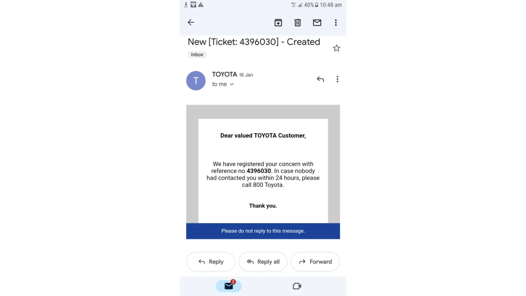 After that I had given a complaint in 800toyota on Jan 18th and they provide the case number and they said they will call me within 2 working days.