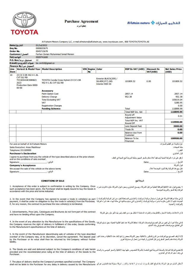 I called Toyota Call center sales dept. on 30-June-22 and inquire to buy a new car Corolla Cross Hybrid 2022 model, the price informed me 102900 full option, also confirmed that there will not be any extra charges and for booking I need to Pay AED 2000. The same day (30-June-22), I visited the Toyota Abu Dhabi-Musaffah Branch around 7:30 Pm where, I met with Mr. Anas, he said he is busy, cannot entertain me today, neither any other person from sales was available. As I informed Mr. Anas that I want to book Corolla Cross so he asked me to send him docs and further he will proceed tomorrow which I send the same time.
