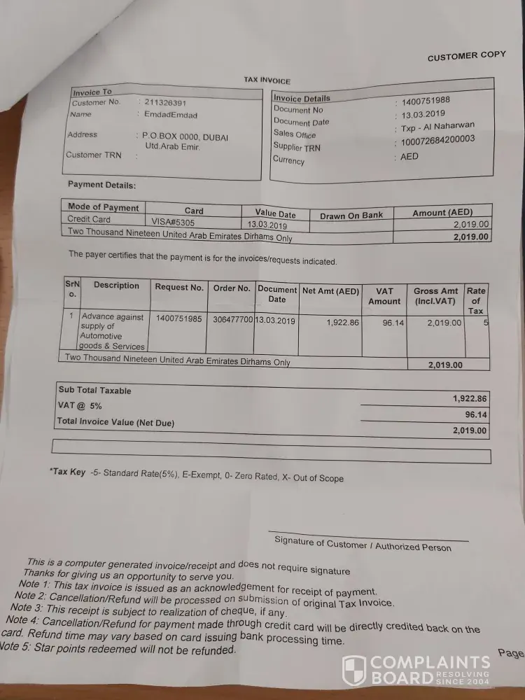 Then, I informed the sales person about the issue and he told me that my AED 1, 000 will be refunded and he asked me the original invoice and he told me that within 10 working days I will be getting my refund amount. However, till now I have not received my money its already 3 weeks.