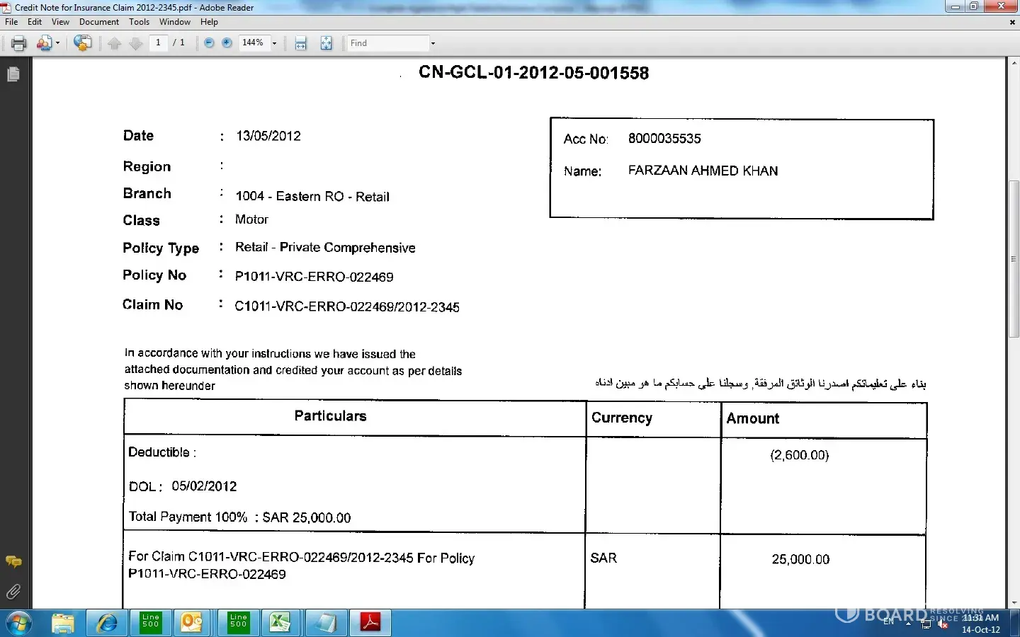 We have Al Rajhi Comprehensive Motor Insurance (claim number is [protected]/2345 ) though the credit Note was issued in May (attached the copy for the same) we haven’t received the cheque