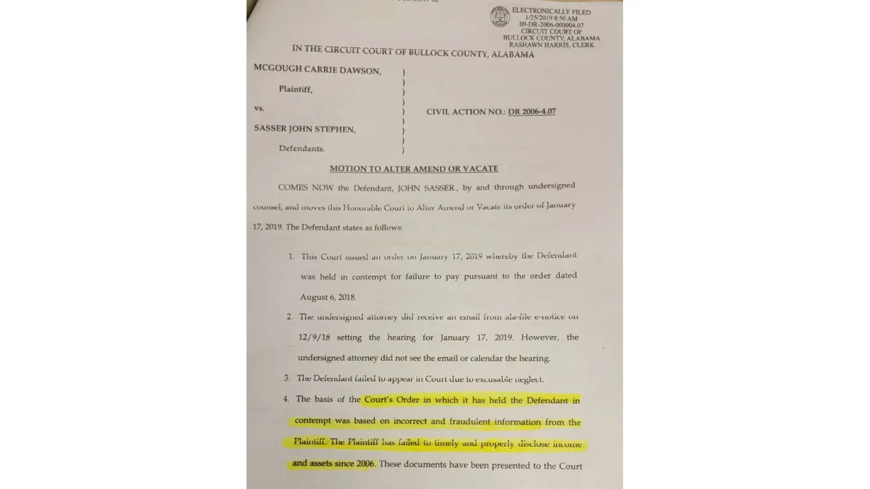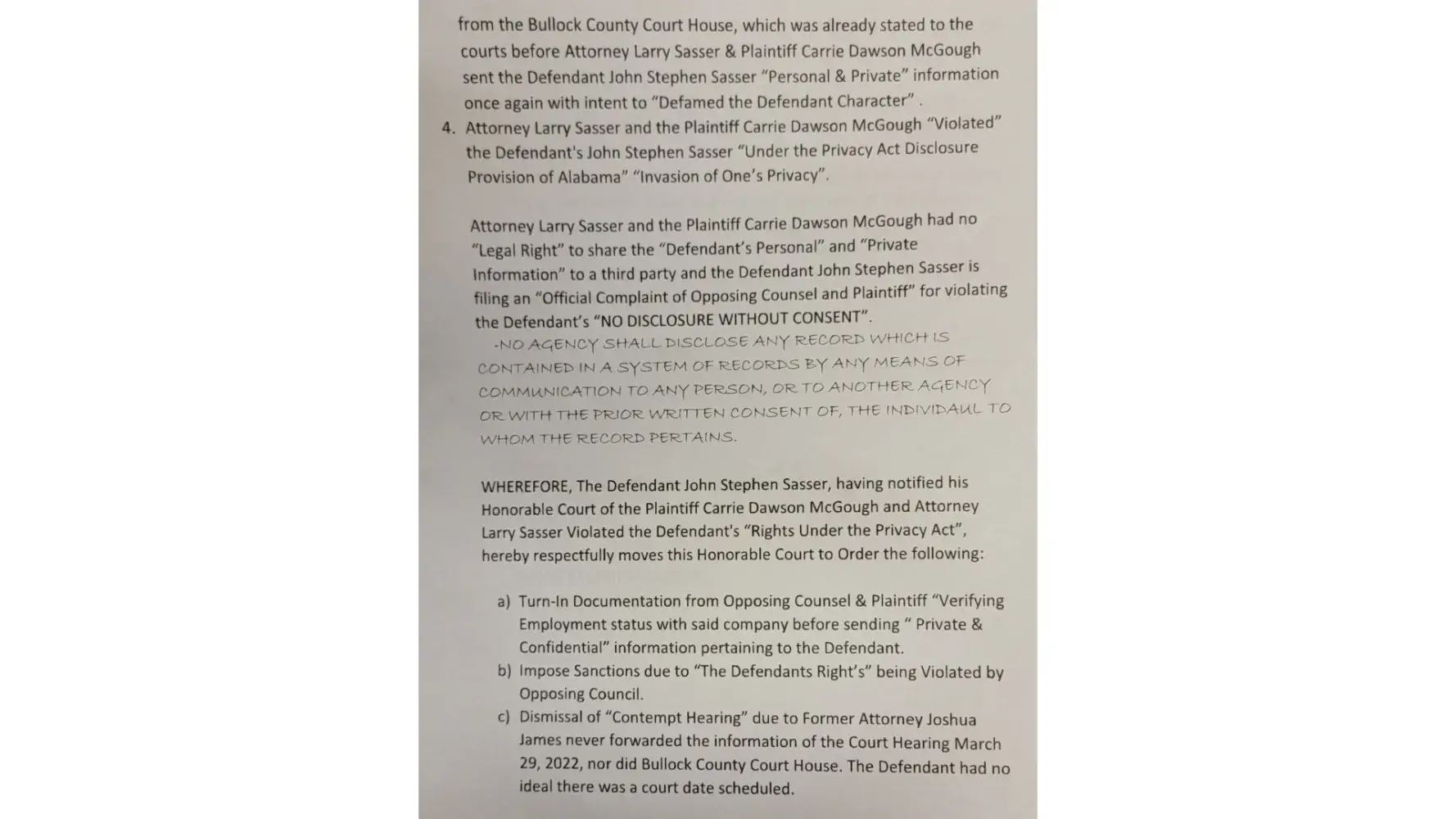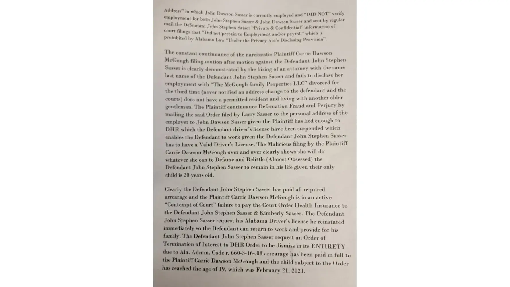 The defendant john sasser has filed multiple court cases against his ex-wife carrie mcgough (plaintiff) with judge smithart of bullock county. The plaintiff and her family are well regarded within the county and with clear and 100% truth documents filed the defendant is always denied. Carrie mcgough is a millionaire and has never kept a job in over 17 years. Attorney clay teague larry sasser and carrie mcgough mailed private documents to a mutual friend of the defendant., clear violation. Orders made by judge smithart with preup and divorce papers agreements are not upheld and dhr of elmore county refuses to meet with the defendant john sasser. The plaintiff carrie mcgough owes over $79,000 in health insurance coverage to the defendant.