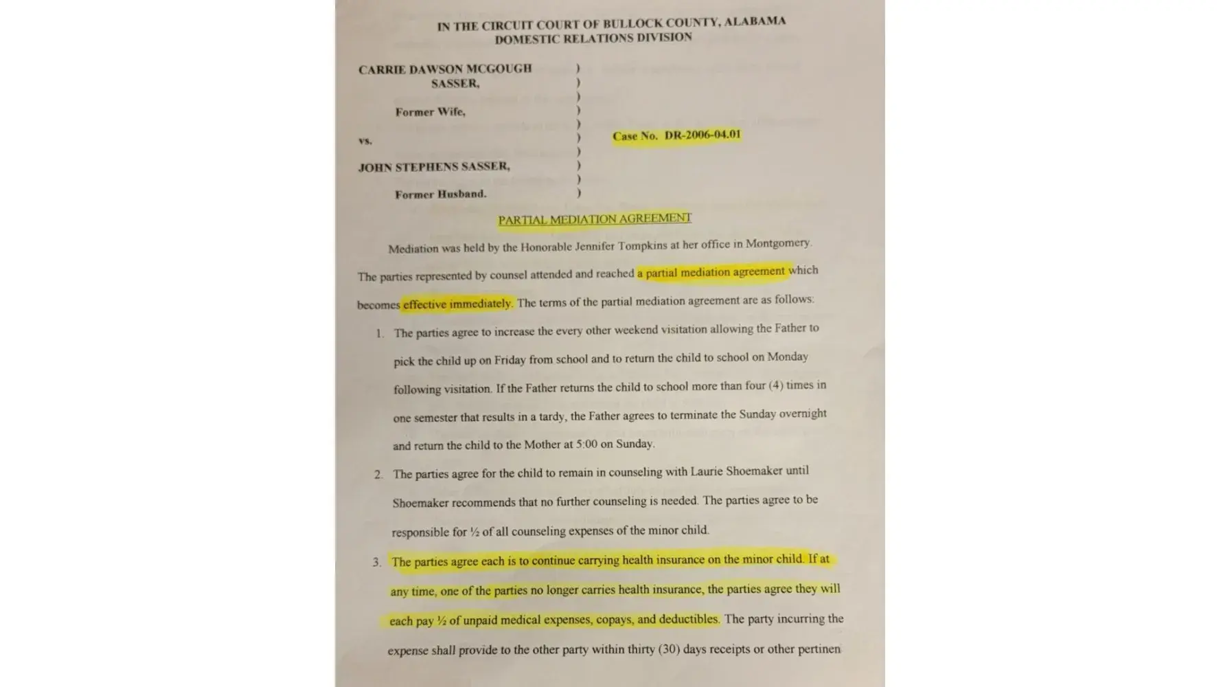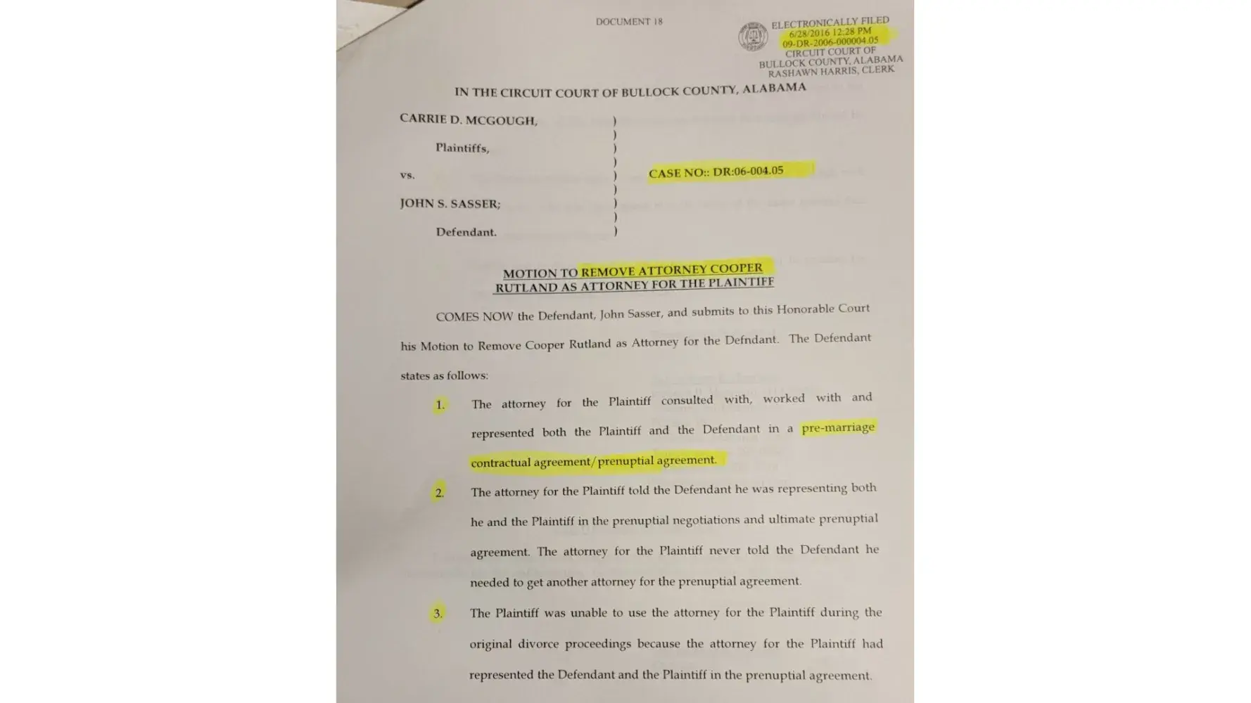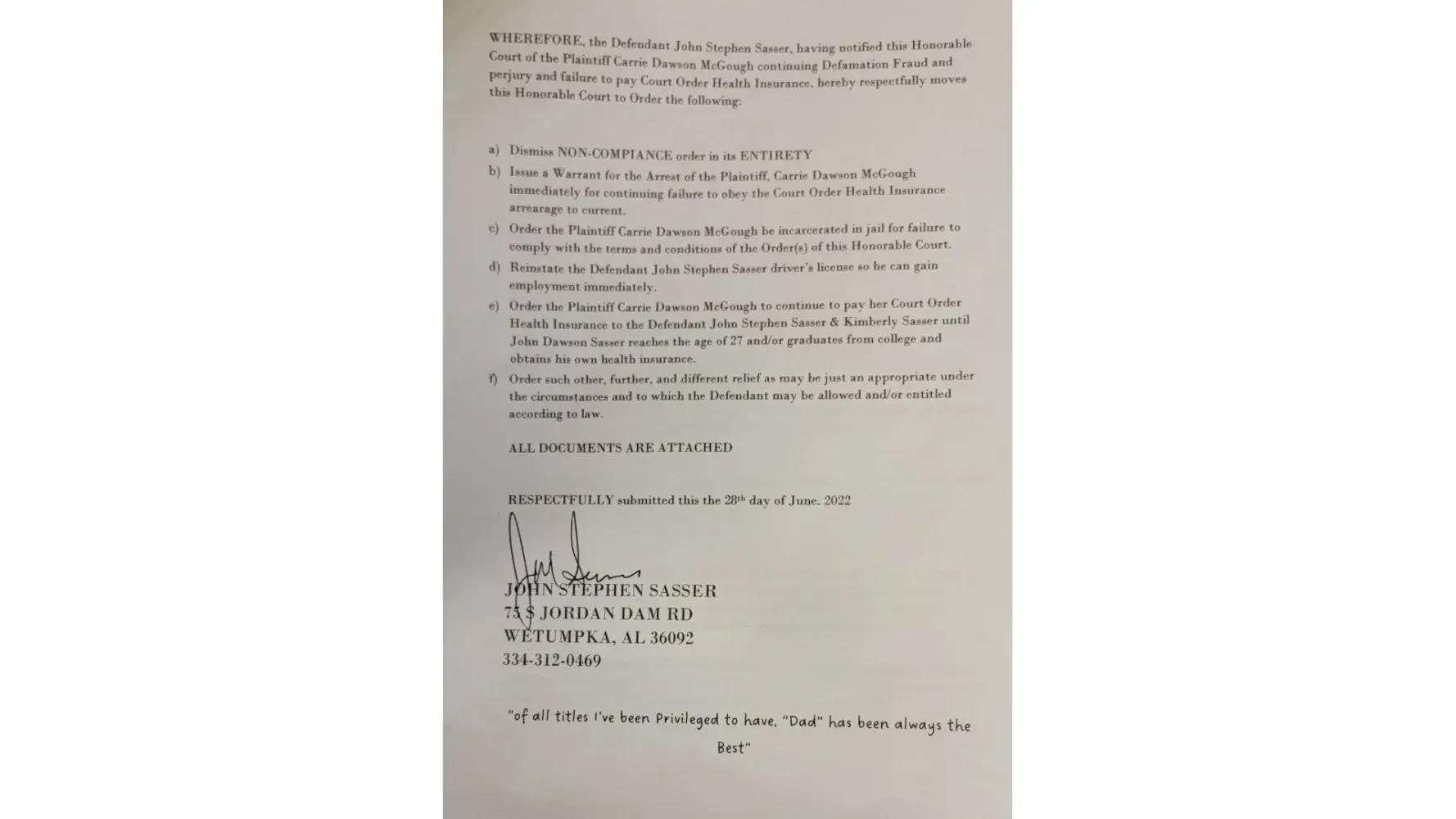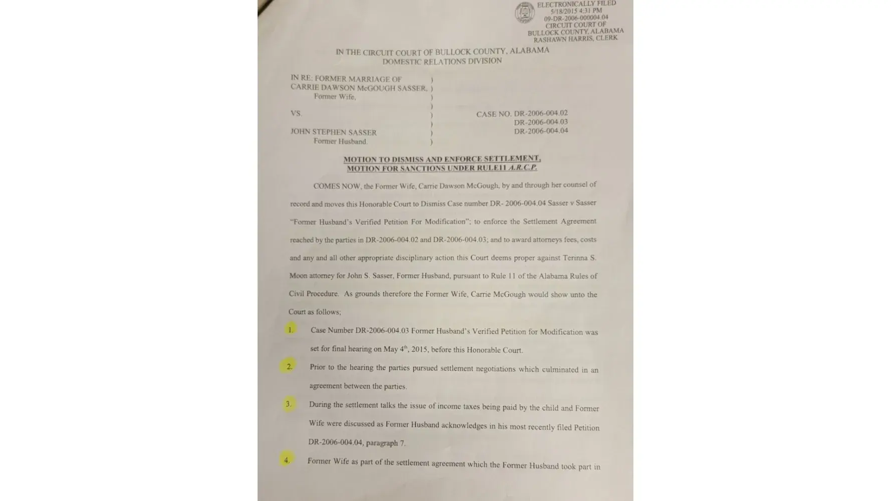 The defendant john sasser has filed multiple court cases against his ex-wife carrie mcgough (plaintiff) with judge smithart of bullock county. The plaintiff and her family are well regarded within the county and with clear and 100% truth documents filed the defendant is always denied. Carrie mcgough is a millionaire and has never kept a job in over 17 years. Attorney clay teague larry sasser and carrie mcgough mailed private documents to a mutual friend of the defendant., clear violation. Orders made by judge smithart with preup and divorce papers agreements are not upheld and dhr of elmore county refuses to meet with the defendant john sasser. The plaintiff carrie mcgough owes over $79,000 in health insurance coverage to the defendant.