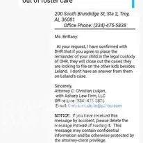 I am writing to formally register a complaint against the actions of Lee County Alabama Department of Human Resources as well as Law enforcement/investigation team, and the unjust custody situation that has resulted from the events that transpired on March 3, 2023. I firmly believe that my rights as a parent and an individual were grossly violated during this incident, and I request a thorough investigation into this matter.