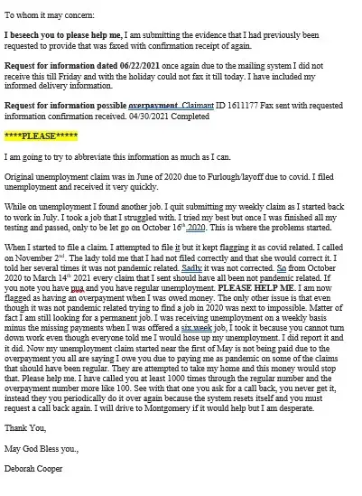 The lady said that she had fixed everything and that the problem was partially the person who tried to help me on Nov 1st, and partly the penalties, Then this year they came back sometime in March and said I owned them 980.00 I think because I got paid for three weeks I shouldn't have been paid for. It doesn't make since. So for the entire time from Oct to March 2021 it should have all been under regular unemployment. Could you please help get this resolved. I have fought as hard as I am exhausted. I cannot get unemployment now because of those fines. Also I have faxed them information that they have requested at least two times. Every time I send it fax with a confirmation to ensure you get it.