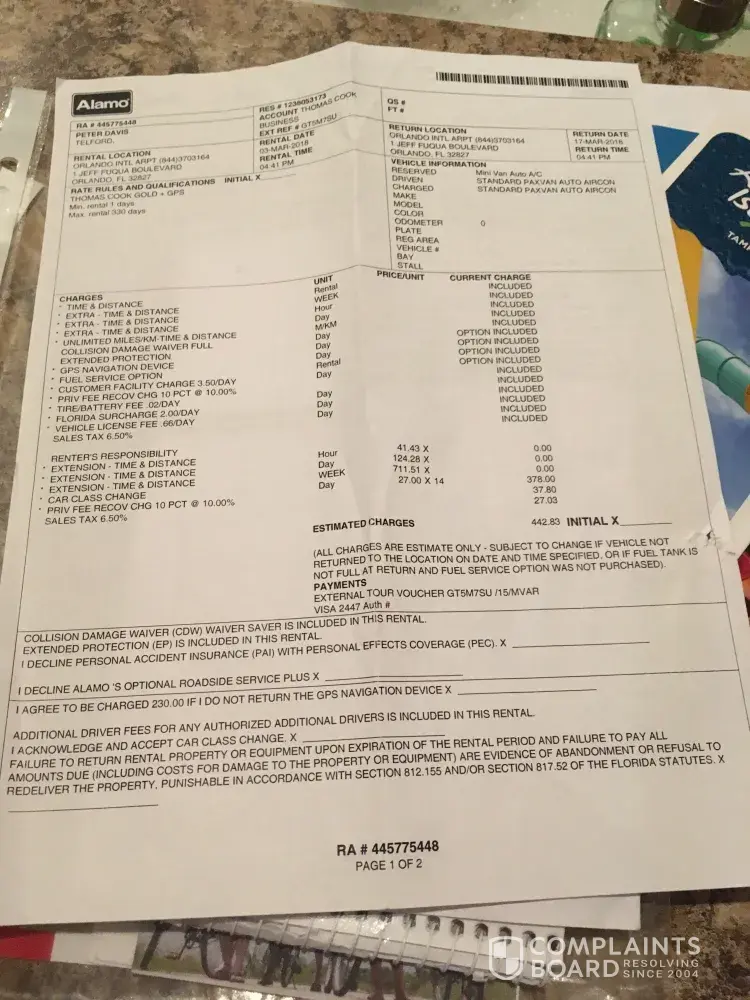 I contacted the car rental booking agent who contacted Alamo, but were told customer signed agreement and without any written communication, it was my word against Alamo. I also contacted my credit card provider who confirmed that I needed a response in writing from Alamo, before they could assist me.