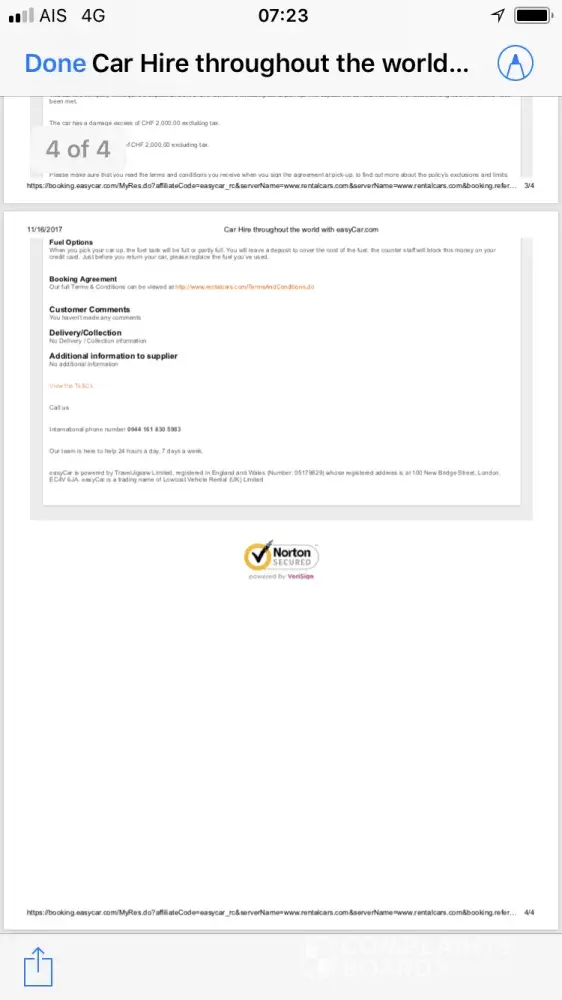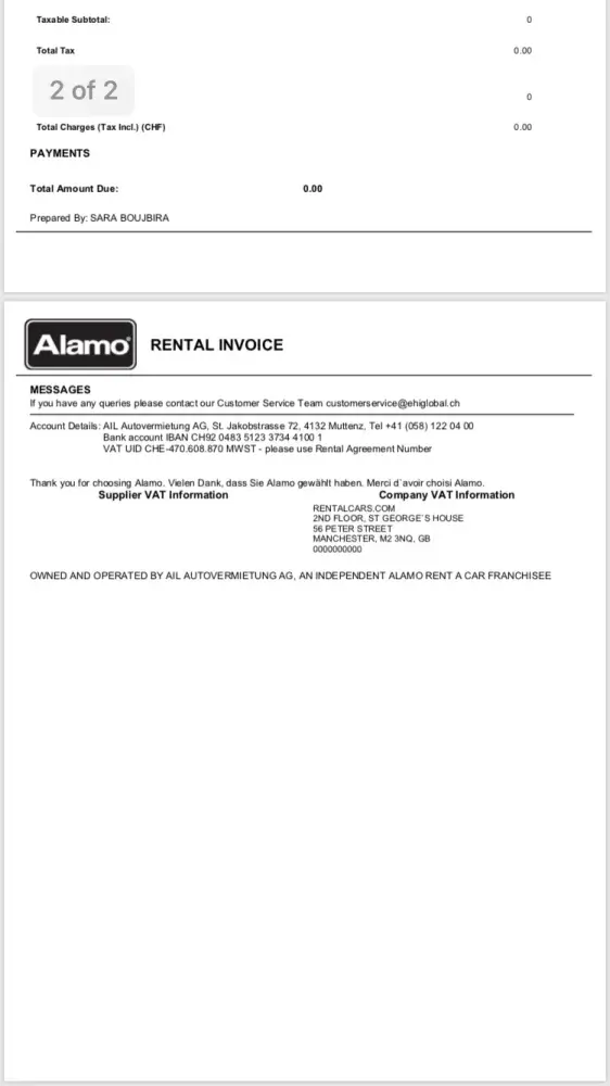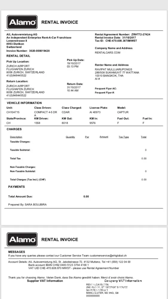 Then On 31 October 2017, I already returned car at Car park in Zurich Airport and Enterprise ‘s officer examined car and told us the car is fine and did not have any agruments. Then officer of ALAMO issued the rental invoice with no amount to pay and send to me by email.
