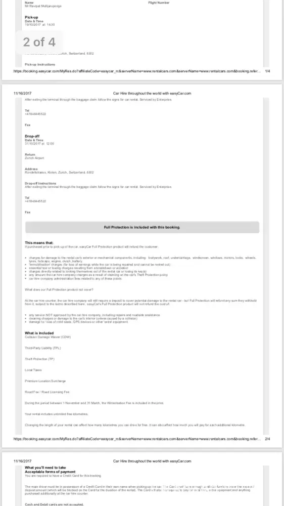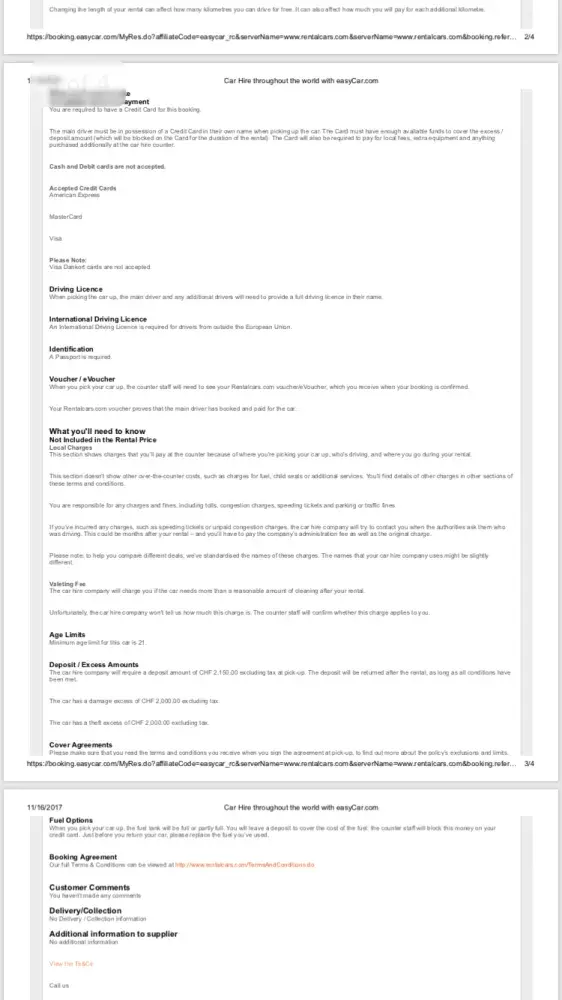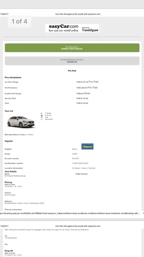I live in Thailand and traveled to Zurich, Switzerland between 19- 31 October 2017. So I reserved car from ALAMO with fully insurance for using in Switzerland between 19-31 October 2017. This reservation was confirmed by website "easycar.com" and I already paid the rental fee by credit card.