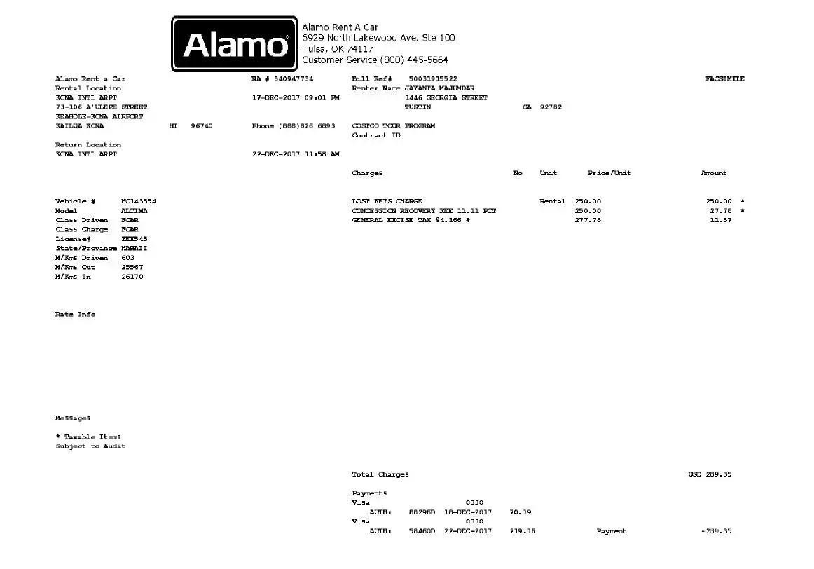 I had rented Alamo Car as part of a Costco travel package, and after returning the car, received a zero balance receipt from the rental office.