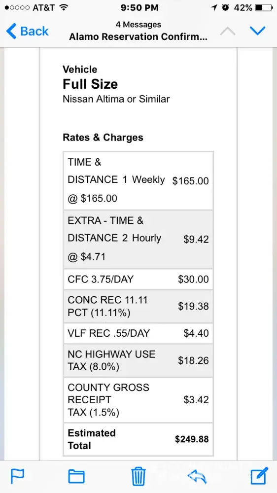 We rented a car at Atlanta Airport on Sept 21 to Sept 25, 2017 because it was 100 dollars cheaper then our neighborhood Enterprise would of ended up being even cheaper and much more convent for the airport is one hour away and had to pay for parking at 12 dollars a day for 4 days when we were told my an Alamo employee that we could park free there on their lot, that was $43.00 Also was told when I called the Alamo Airport Alamo employee told me there was no add on fee for a spouse driver. When we arrived the charged us $54.10 dollars for my husband to drive. So there is my 100 dollars I saved. We also had to unload a Mimi van into my car with my 97 year old father and all his belongings may I add my deceased mother was an artist and her sculptures where extremely heavy which in hind site we should of used our friendly Enterprise rental in my neighbor hood to unload only one time in to my house instead of in the paid parking lot at the Atlanta Airport.