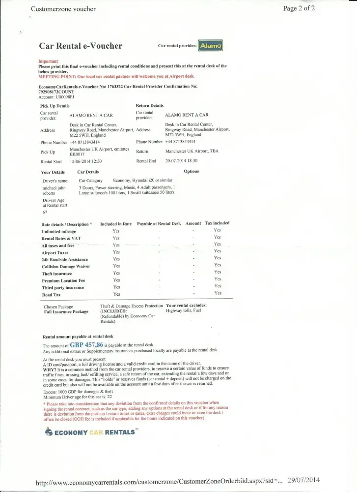 Also a car rental voucher for Alamo Rent a Car at Manchester Airport. This stated an amount of GBP457.86 to be paid at the rental desk, and this included Full insurance package (copy attached)