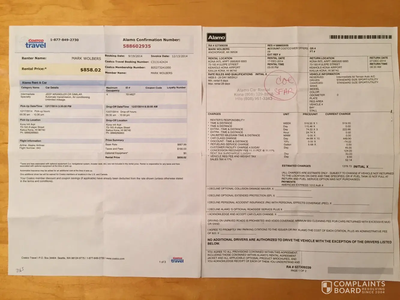 My wife and I made the rental car reservation in September through Costco for a Jeep Wrangler or similar. We were vacationing with a senior couple and needed a four door vehicle. The Wrangler is available in both 2 and 4 door models, but to make sure, I called Alamo to confirm that my reservation reflected my need for a 4-door vehicle. This call sounded like it was routed out of the country, and the representative could not say if a 4-door vehicle was available but said she would make a note on my reservation.
