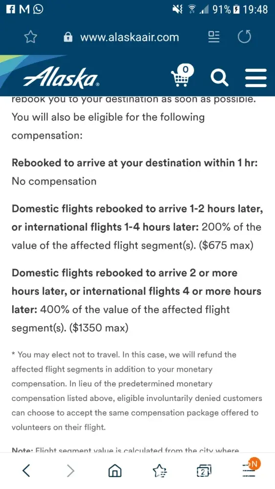 Alaska Airlines delay compensation as described on website not given