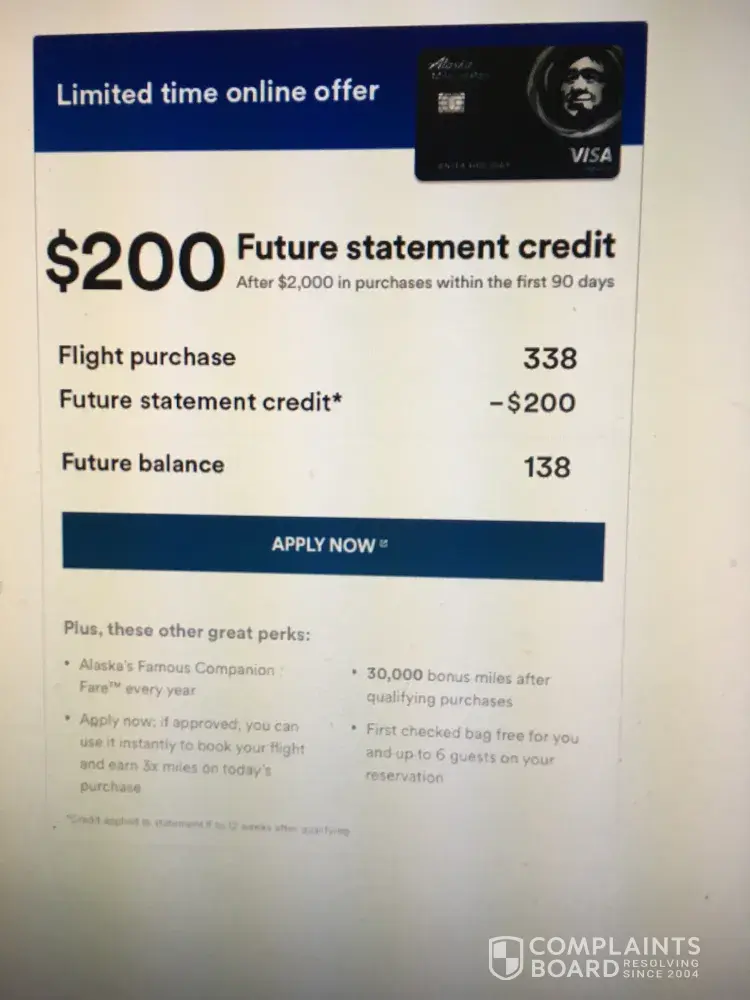 I am so upset with Alaska Airlines. On Jan 4, 2020 (EKGLOW), I was checking for flights to KOA, I found a flight on Alaska and was enticed into booking it because of the Alaska Credit Card Promotion which would have given me a $200 statement credit off of the cost of my flight, along with other perks such as a Free Checked Bag. So I completed the online application at the time of the booking and received a pending notification which did not indicate how long I would have to wait for the approval. So I waited a few minutes and then received a pop up from Alaska asking me if I wanted to continue with the reservation I needed to input payment information. I could not get back to the screen that had my pending credit application info to check if it had been approved yet so I input another credit card to secure the reservation until the Alaska Card approval came over. I did not know that once a reservation is secured with a credit card that you cannot change the credit card info on the reservation. I would never have booked this reservation if I knew that I was not going to get to use the Alaska Credit Card on this reservation. I was expecting a $200 statement credit and a free checked bag. Meanwhile my traveling partners have booked on other airlines because of this glitch and now I am traveling alone.
