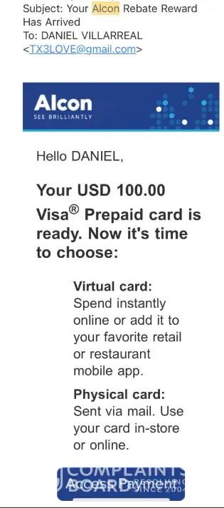 In 2021 I purchased a years worth of Alcon contact lenses. I only purchased a year's worth due to the rebate offer of $100 because I would normally never spend that much money on contacts. I did receive my gift card but it was near impossible to use. And by near impossible, I was literally never able to use it. I tried transferring funds to my Amazon account, tried making a purchase at Best Buy (physically and online) and several other businesses. Sometimes I was asked for a PIN (which I had never set up and had never been provided). Finally, knowing that the "expiration" date on the front was approaching I even tried transferring the funds to my PayPal and Venmo account and it got declined both times.Once the card DID expire I logged onto my account to ask them to reissue it only to find out there is no way to do it. Once the card expires the money is gone and can't be replaced. This is a violation of gift card laws but they get around this by expressly stating it's not a "gift card" it is a "reward." Some reward. Limited window of use and technical problems when you try.I would like an actual $100 rebate that I can use.