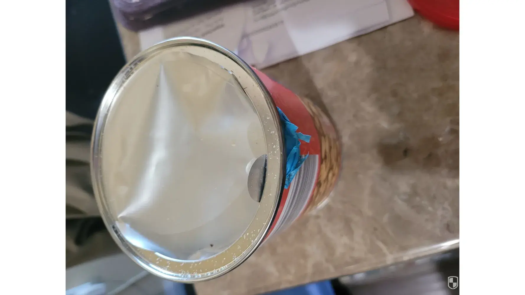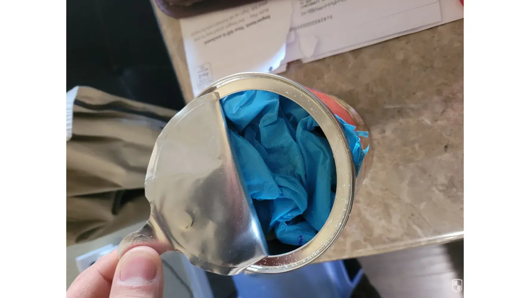 My mother purchased a can from aldi, she opened the package last night and peeled the foil off the top of the can. She noticed a blue item laying over the top and thought maybe it was to seal freshness. As she peeled it back, she noticed it was a blue latex glove. It seemed it was stuck during the packaging process. Looks like the top lid was sealed on someone's glove and rather then taking the top back off they took their glove off and left it inside, the glove is sealed from the side