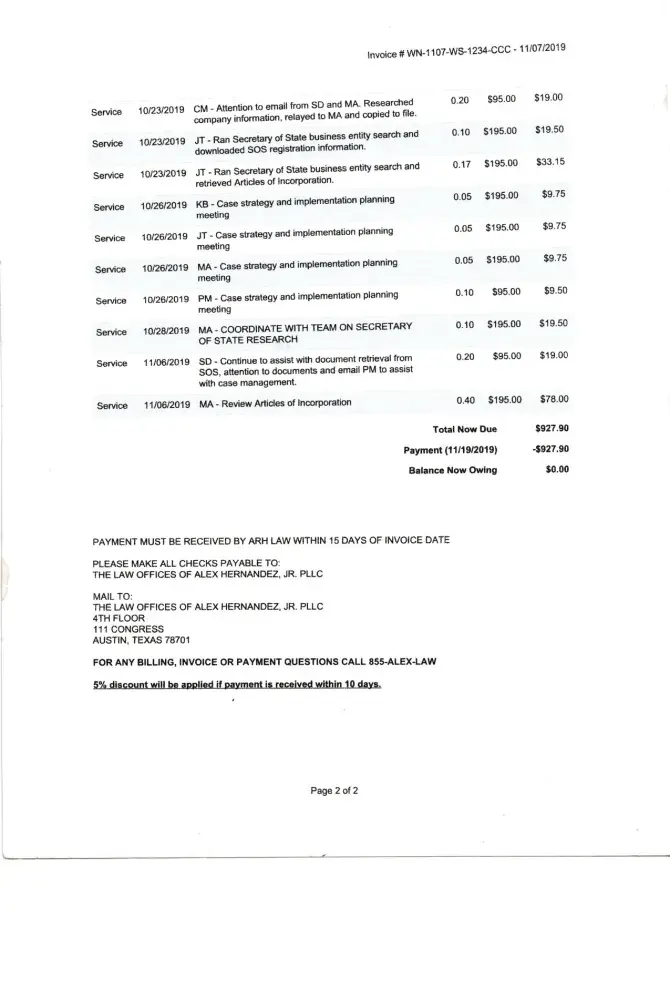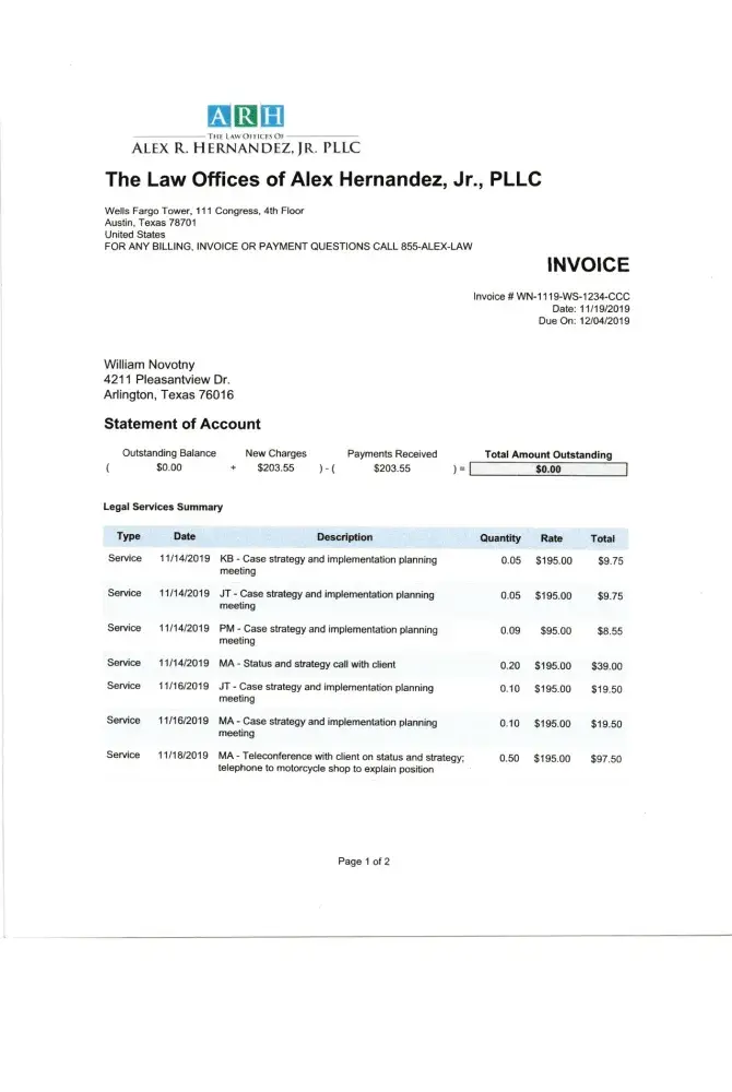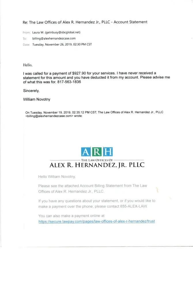 Please save your money and don't end up being conned — as it seems I obviously have. Alex R. Hernandez Jr. Law Firm is pulling a SCAM. Hopefully my warning will save someone from becoming their next victim.