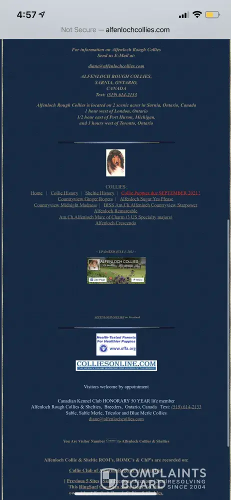 My final text communication with her was on October 10, 2021 where we once again addressed our concerns, that we had lost faith and trust in her and that we no longer wanted a pup from her. We again asked her to return our deposit because it was the right and ethical thing to do and we did tell her that we would have no other options than to make complaints to the CKC. and others. PLEASE, PLEASE, PLEASE LET THIS BE A WARNING TO ALL BUYERS, DON"T LET THIS HAPPEN TO YOU. SHE HAS DONE THIS MORE THAN ONCE FROM PAST REVIEWS. As of today October 11, 2021 Alfenloch Collies website is still saying pups available in September and ready to go for November.