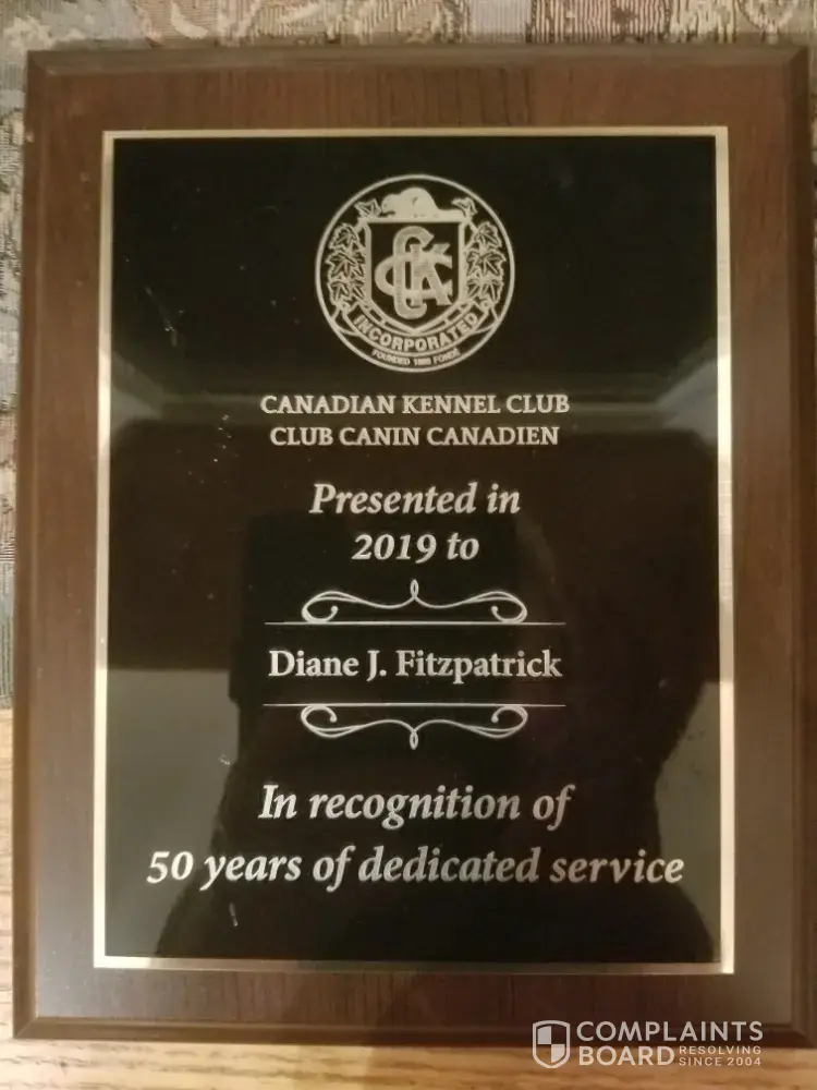 Not only are we completely disappointed in Diane's lack of professionalism, but we're disappointed in her character. When I expressed how upset I was in our experience with her and disheartened that we trusted her, she proceeded to send me a picture of a "Canadian Kennel Club" plaque presented to her in "2019"in recognition of 50 years of dedicated service"(picture attached). All I have to say is this, if the Canadian Kennel Club prides themselves in their ability to"speak out on major issues concerning dog ownership and the health & welfare of dogs across Canada" they need to do a bit of a deeper search. A simple google search will show a darker side of Alfenloch Collies. Take a look for yourself.