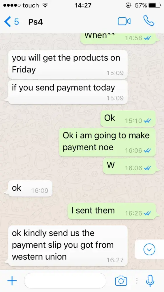 I was searching on alibaba for ps4 pro and then i found an add that took my attention and the supplier had 3years gold member so i took his number from the add (+[protected]) and contact him i asked him about the safety he told me (we are verified Gold member on alibaba and before alibaba could make us verified, they came to our warehouse and see we are legit supplier...so we are assuring you 100% guarantee that your package we get deliver to your doorstep, we are giving you 100% money back guarantee, you love it or your money back. we are do confident, we give every client a 100% risk-free, money-back guarantee. first-class, personal services, precisely targeted, time-tested..) so i asked about the payment methode he told me western union he gave me the western union info and i sent him the money (250$) and i should have gotten the ps4 in 4 days i contact him after 4 about the ps4 he told me that it has been delivered to your country and need another 250$ for the assurance i told him i dont have the money and that i wanted my money back and then he blocked me and lost my 250$ how can you help me please i worked for a monthe to get that money i sent the western union so you could see the payment and then the add that was in my history and now it's unavailable and the conversation pic of the western union info
