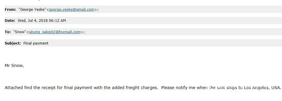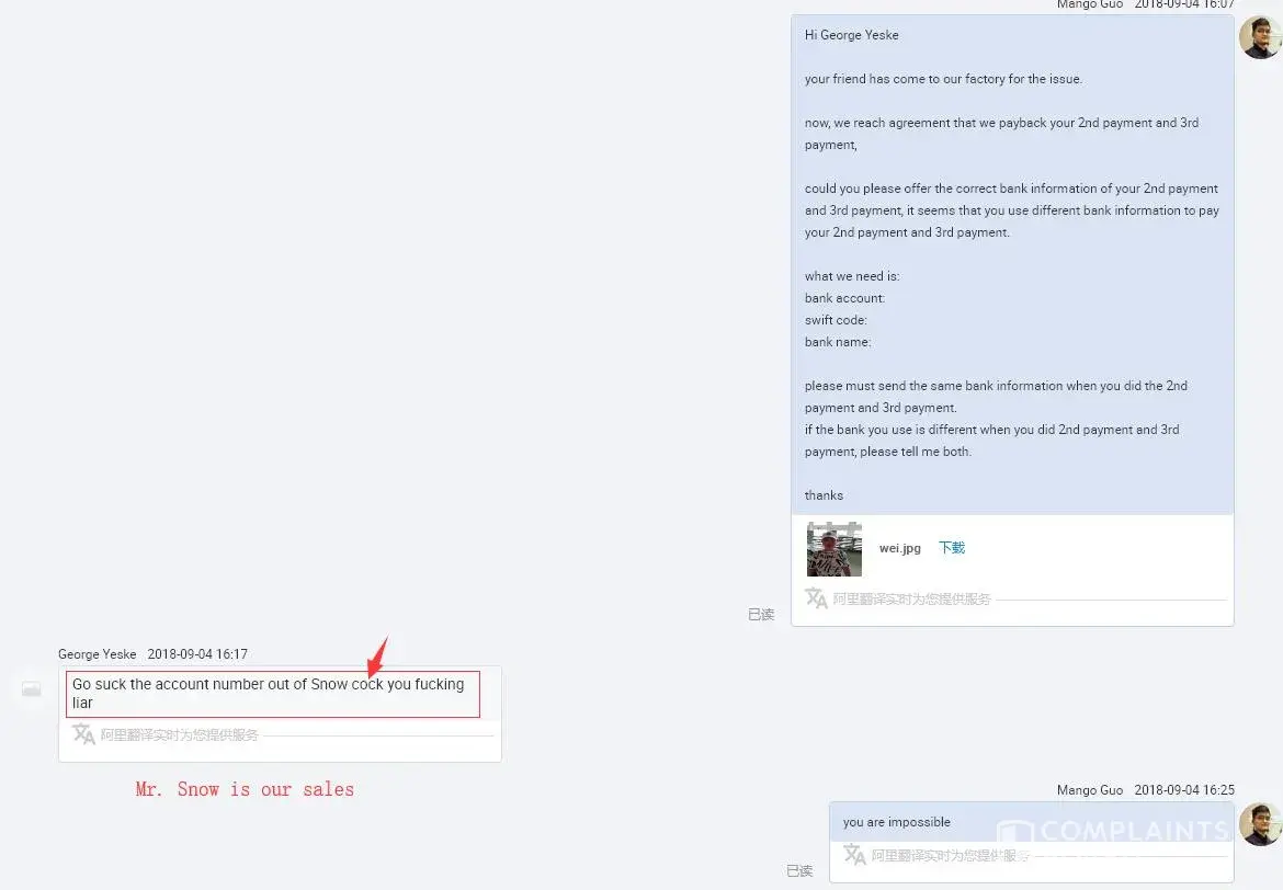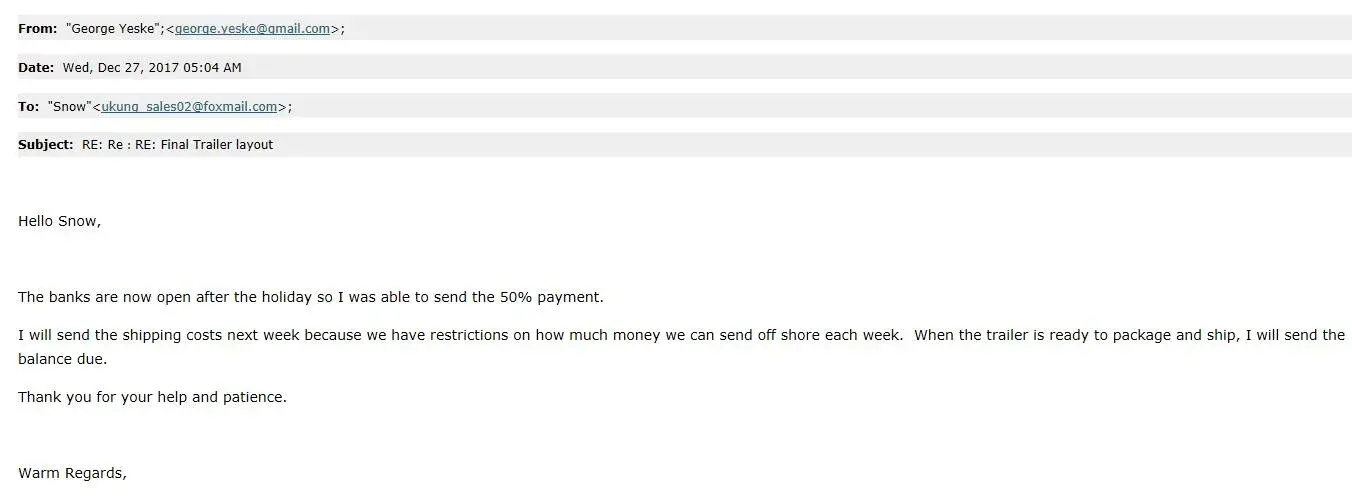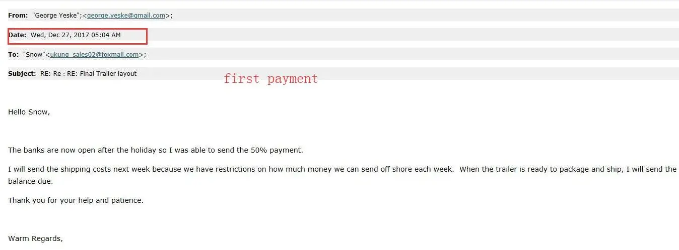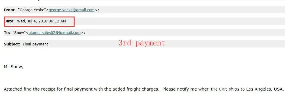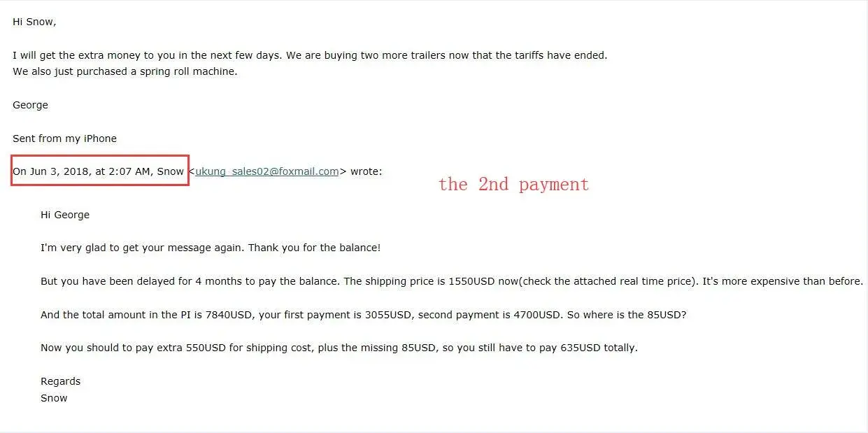 again there were trying to extract more money giving some odd reasons then i realized i am scammed . i would appriciate if you can refund my hard own money please. because ive requested a quote to alibaba offical app so the information was leaked from your end . im at attaching screen shot of the email and later if u need screen shots of whatapp chat i will do it. please refund my Rs.19020.00 INR.
