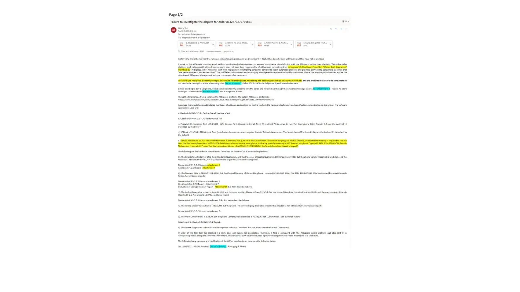 I filed a complaint on December 8, 2021, and provided evidence of my complaint to the AliExpress website. In addition, Sat 12/11/2021 11:14 PM, I also reposted with a clearer complaint detail picture with seven (7) attachments to prove the customized Cellphone does not match my order. In return, my complaint was not investigated, and your office closed my dispute on 12/13/2021 9:16 AM. See Attachment 1 - 9