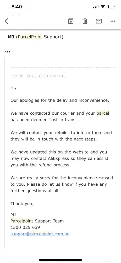 Parcel Point the shipping company has advised to get back in touch with Aliexpress regarding a refund. However they have refused providing it. Now I don't have a product and I don't have my money which is $100!