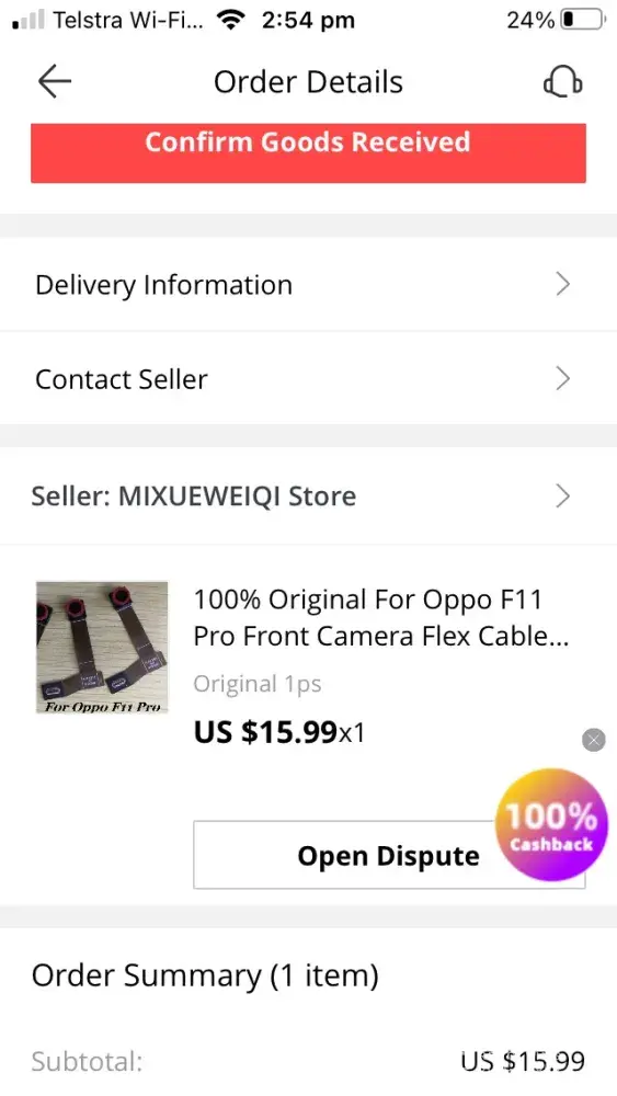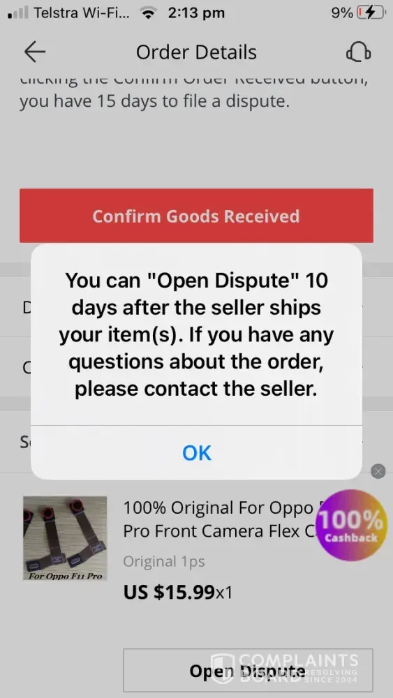 15 day dispute lapsed and was told to deal with the seller direct. seller was not helpful at all. went back to aliexpress and they couldnt help me either.