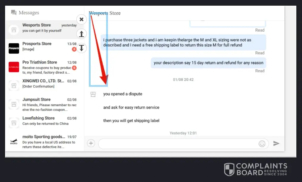 The Westport Store offered easy free return shipping label, And the Aliexpress Dispute says you don't have enough evidence when I have sent pictures, you the customer has many reasons to choose the closet is item not described, you do not have the option to click item to large or big. So now the Westport Store and the Aliexpress Dispute together giving me the Customers the back and forth with trying to return items that do not fit when the advertisement for the item clearly says easy free return shipping for any reason within 15 days of receiving the item.