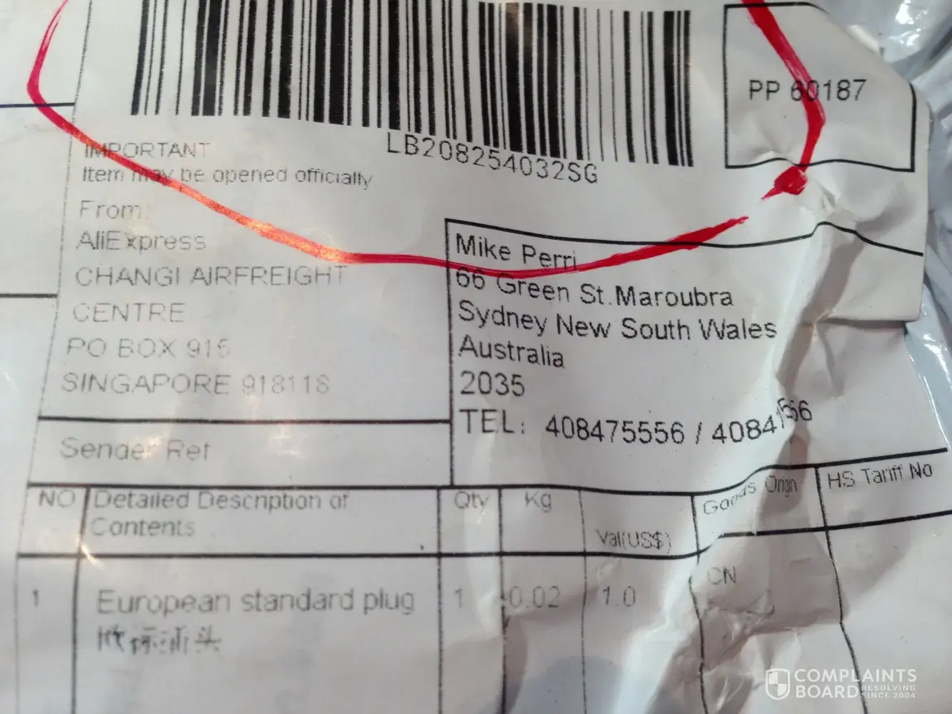 (2) Checked with Australia Post - verified that an item was sent. However, I indicated that I had received nothing. During discussions with the AP Officer, it occurred to me that in fact I did receive an item- a standard European power plug! I did not order this item.