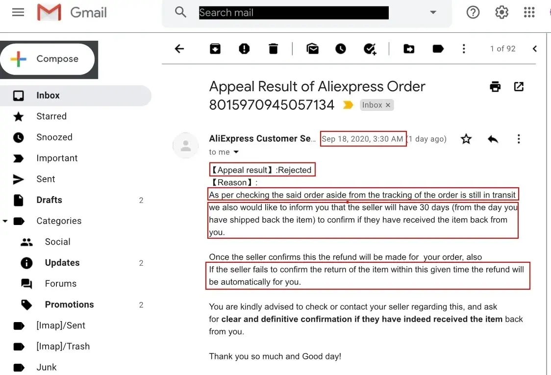My appeal was rejected with reason:"Parcel still in transit and the seller not confirm that goods are received". They ignore my screenshot that seller received the goods. And also he not reported to AliExpress that he received the goods. And that the seller ignores me and not answered on my messages.