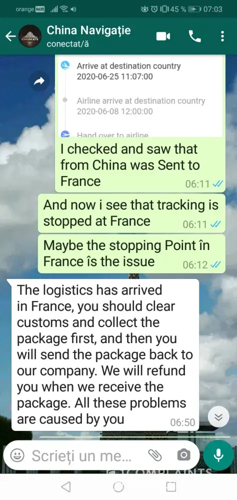 I tried to solve the issue with seller and they blaim me for this, telling me i have to pay taxes and send the parcel again. But i live în Romania and the parcel îs stucked în France as they delivery from China to France stop and after to me.