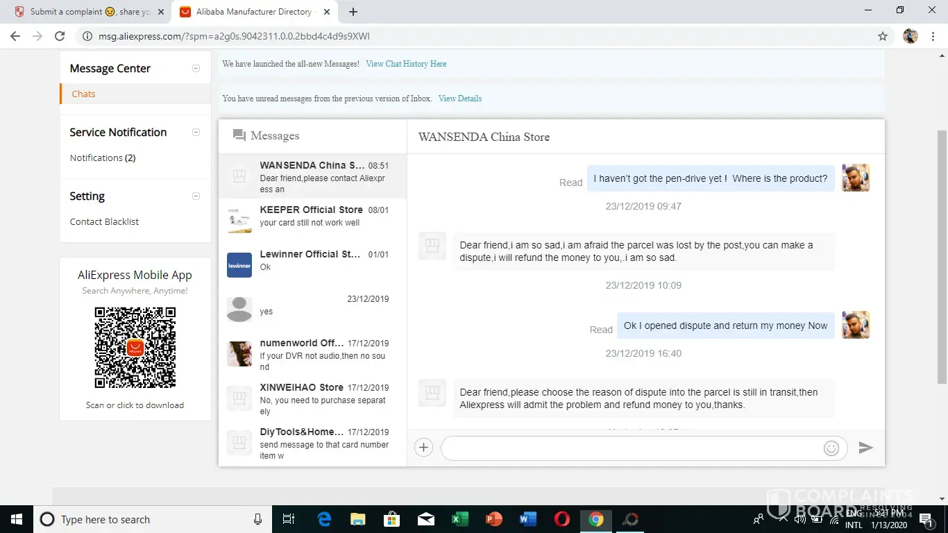Bought this "order no [protected]" vpecker e1 obd2 car scanner wifi professional diagnostic tool £195 after I got the item I was having problems with it so complained about it and got part refund £39 from the seller, about 3 weeks later it stopped working, the seller told me to send it back for full refund, I did that>>>>> https://www.royalmail.com/track-your-item?spm=a2g0s.imconversation.0.0.23083e5fvI3sTa#/tracking-results/RY087339761GB They have the item back now and now no communications from them, I have contacted the help on aliexpress 4 times now with a promise to sort this, they keep telling me I got my refund £39, I keep telling them I am wanting the full refund for the item I sent back "please see royal mail tracking, I keep telling them to look at all the messages I have sent to uobdmall store in my account but they tell me they cannot see them as they are not authorise to do that. I know I got my part refund £39 for when I had the item still at my address and was happy with that, but when it stopped working and sent the item back for a full refund this is what I am trying to get back but they keep thinking it is for the £39 part refund, please please can you help on this mater.