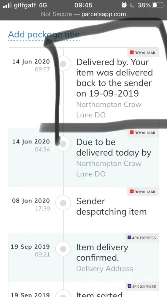 My address is 12 arran Avenue deans south. The seller has only used deans south as an address for me. Soo when the item arrived at local post office, they returned it instantly. Here is the tracking number. GV037735844GB.