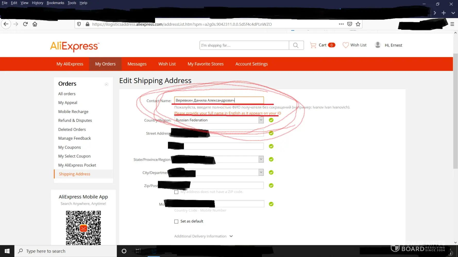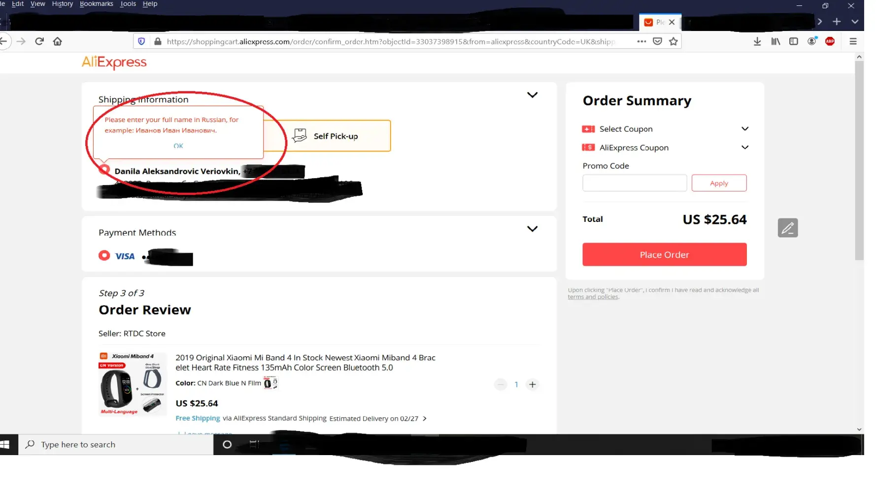 The main account panel with all the addresses i may contain, is required to fill in in English specifically, when trying to order an item for my friend, not myself, im allowed to freely use the delivery option to the stated address, and if i choose the Self-Pick up option it states that i need to change the receivers name into Russian, but when you press "OK" and fill in the name In Russian it doesn`t accept it, stating to do it as in the example in English, which doesn`t work as well and isn`t accepted. So that`s one of the main issues, that the system doesn`t work properly for the Self-Pick up option. Futher more when you asked to change the name into Russian, besides the name, they are asking to fill in sensitive private information(ID information) which is unacceptable, since im purchasing it from my account where they already got my personal information, and asking me clearly sending an item to another person, for this persons sensitive information, which is totally unacceptable ! Since how would i manage to obtain another persons ID information, and how would that be legal? So this is totally not safe and very doubt the fact if it`s legal on Aliexpress behalf, to ask a customer to provide a totally random persons sensitive information!