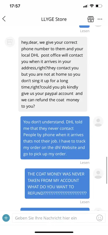 I ordered a jacket one month ago and the seller told me in the beginning to send him my phone number because when my package arrives DHL will call me to pick it up, so i waited. Today i called DHL and i was told that my package was sent back because i never picked it up and they informed me that the seller gave me wrong information because it's not their job to call the buyers to inform about the package, i have to track it myself on the main website. I didn't know that so this happened. Now the seller wants the shipping fee money back even if it was not my fault that i was wrongly informed of him. Now he even wants my paypal bank account to refund the money for the coat even if i didnt pay it yet. Here are proof pictures for you so you can understand.