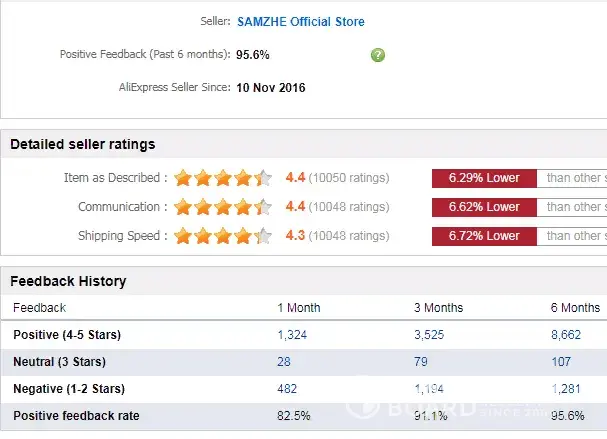 SAMZHE Official Store (https://www.aliexpress.com/store/feedback-score/2687008.html )- rating 95.6%, but if 8662 positive feedbacks for 6 months divide by 10050 total feedbacks = 86.2%