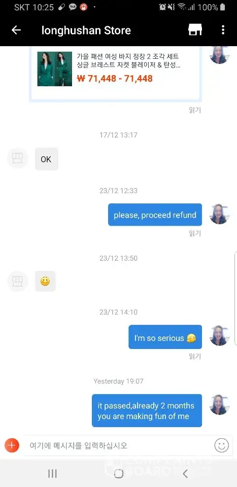 I bought on October 9th a green suit at longhusanhouse store. As I received the product, I returned it to the sellers on October 29th. Although they received the cloth, they are not refunding my money rather they are making fun of me. I begged them several times.. it is so annoying! PLASE SOLVE