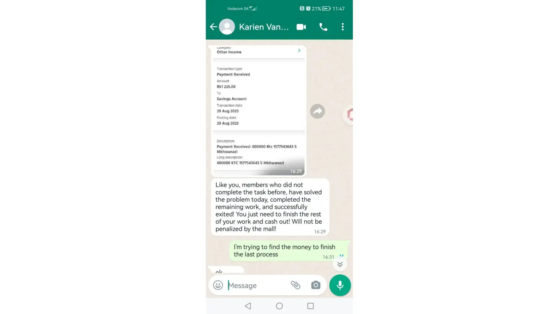 Due to no more money available in my bank account due to paying for the tasks provided on the platform I cannot continue to work further on the platform and requested my manager Karien to please arrange my earned commission to my bank account.