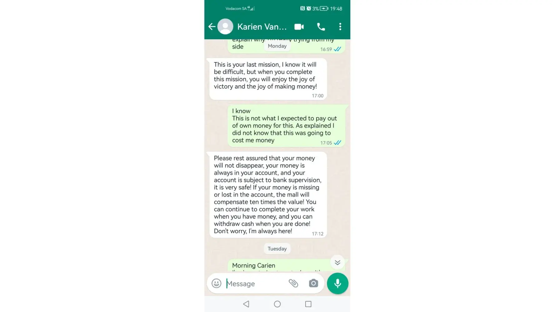 I have done the work on the platform with money I had to loan from family as I was told that I had to do the last order that I was struggling to get money to do. I then tried to withdraw my commission as agreed with the manager I work under and was blocked from withdrawing the commission I had earned to start the next task as agreed with my manager Karien.