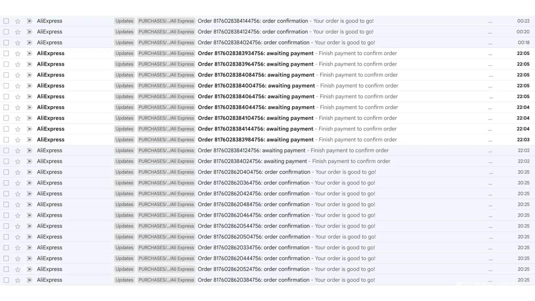 I placed and paid for 11 items from my cart on AliExpress. Everything was separated into their own order numbers and email confirmations were sent to my inbox from Aliexpress. All 11 order confirmation emails was received from the above time to indicate that all my orders were completed.