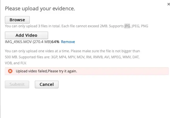 My dispute was automatically closed for a fraction of the amount before I could get all the evidence uploaded. Pic below shows that their services did not permit upload to finish. Dispute was auto-closed on october 30 around midnight est.