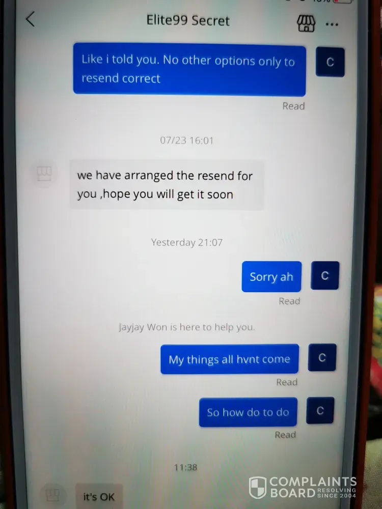 Contacted seller on 14th July, took a week to reply on 22th July. Jayjay Won was the one assisting. Asked for refund but seller keep wanting to resend. Contacted seller on 27th July, item not received yet. Replied me with it's ok.