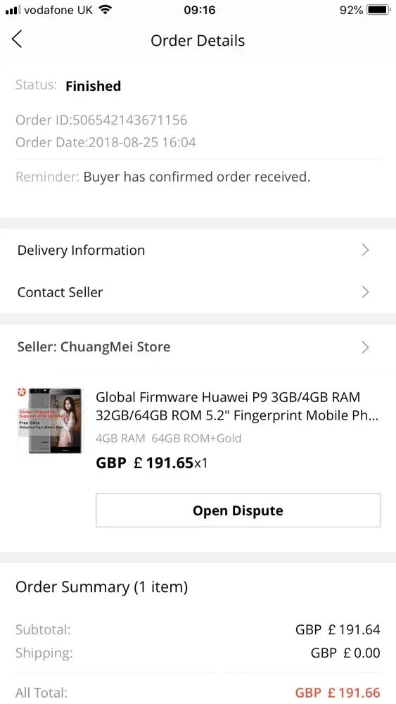 order not received / cannot open dispute