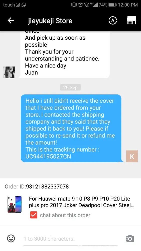 But not recieved then I told then they said we have resent you the mobile cover but not recieved. I dispute the order but they requested to cancel it. So I agree but still I have not received. It is not fair I am using this app many times I bought 20+ products buy this happened only with this product