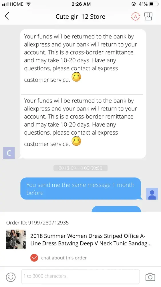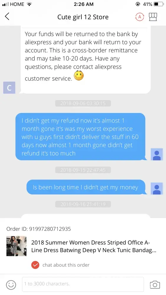 Hi I order one dress in june 25 but I didn't received I open disputed so I get my money back seller accept the disputed but didn't refund my money it's 2 months gone but still I didn't receive my money so I want my money back but the store doesn't response me and behaving so bad attached here all conversations picture thank u plz help me thank u I hope u guyz help me