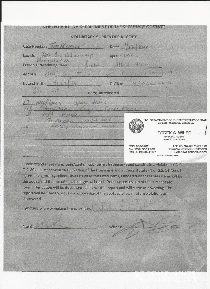 I ordered over 100 NFL Rings From AliExpress in 2017 and 2018 that I was Collecting to sell on the Internet and at Flea Markets when the weather warmed up. On January 12 of 2018 I had Six Agents from The North Carolina Department of The Secretary Of State Confiscate 113 Remaining Rings that I had Left. They also Confiscated17 Necklaces. I talked to My Bank (BOA) and they said to talk to you about a Refund since the Rings contained Counterfeit Trademarks, even though the Rings were Confiscated. The Agents said it was a Felony to Sell, Buy, or Own the Rings. Since I had no idea that it was illegal to Buy the Rings there were no Charges filed as long as the Rings were turned over to them. My Bank said if I Got no Results then to Call them back and they would turn it over to their Fraud Department and let them Handle it. If necessary they would Contact the NC Dept. of The Secretary of State. I Done a Rough Estimate of the total worth of the Rings and it came up to around $600.00, that includes the Necklaces. I figured my amount was actually less than the actual Amount Owed. If I need to I can Go into a Detailed Count which will show a Larger Amount. I am Also sending a copy Of the Voluntary Surrender Letter With a Card with the Name of the Head Agents Name and a Count of the Items Confiscated. I am Disabled and been sick is the Reason I have been so late getting this to you. It doesn't matter how long it has taken because the fact is the product is Counterfeit and being sold by you, as a matter of Fact they are still being sold by you, which I don't care as long as I get My Money Back. My Bank called me and said I need to get this Resolved as soon as Possible, if not they would go ahead and turn it over to their Fraud Dept., so I need an Answer ASAP. Thanks