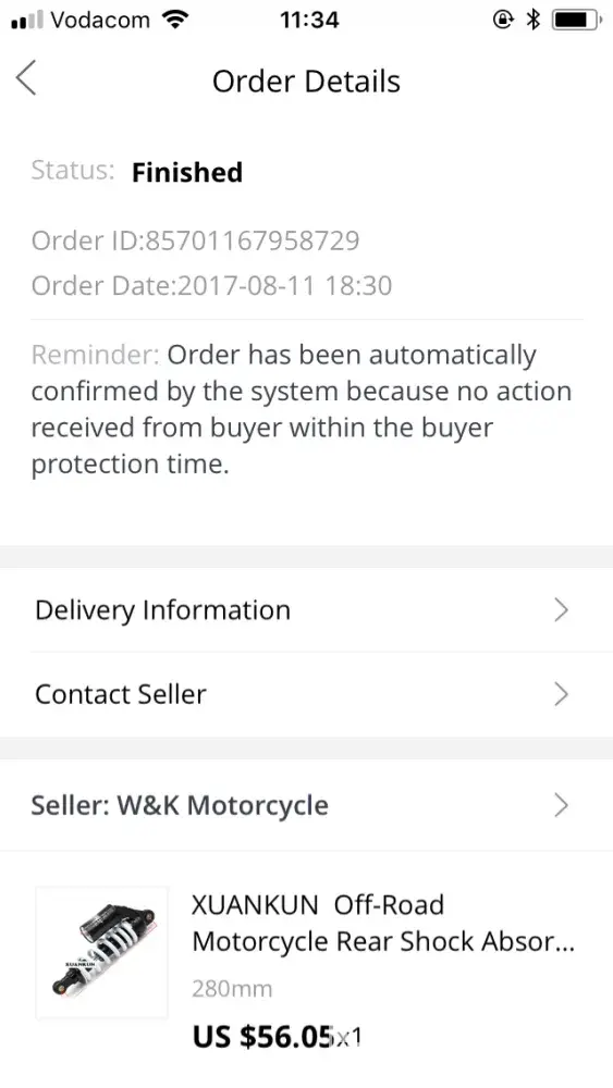 I bought this shock absorber from ‘W & K motorcycle' on Aliexpress. Once payment was processed I was told by seller to be patient in awaiting the receiving of the goods. After 4 months I contacted the seller to query my order. I did not receive a response. After a month following that, I again asked on progress. He then told me the item may have been lost. When I tried to open a dispute on aliexpress I was not able to do so, as ‘disputes can only be opened up to 15 days after you have confirmed receiving your items'. At no point did I ever confirm receiving the goods on the app or website. I have now lost $56, with no option to dispute or request a new item. If this is not resolved I obviously would never consider using aliexpress again, despite it having a great range of products.