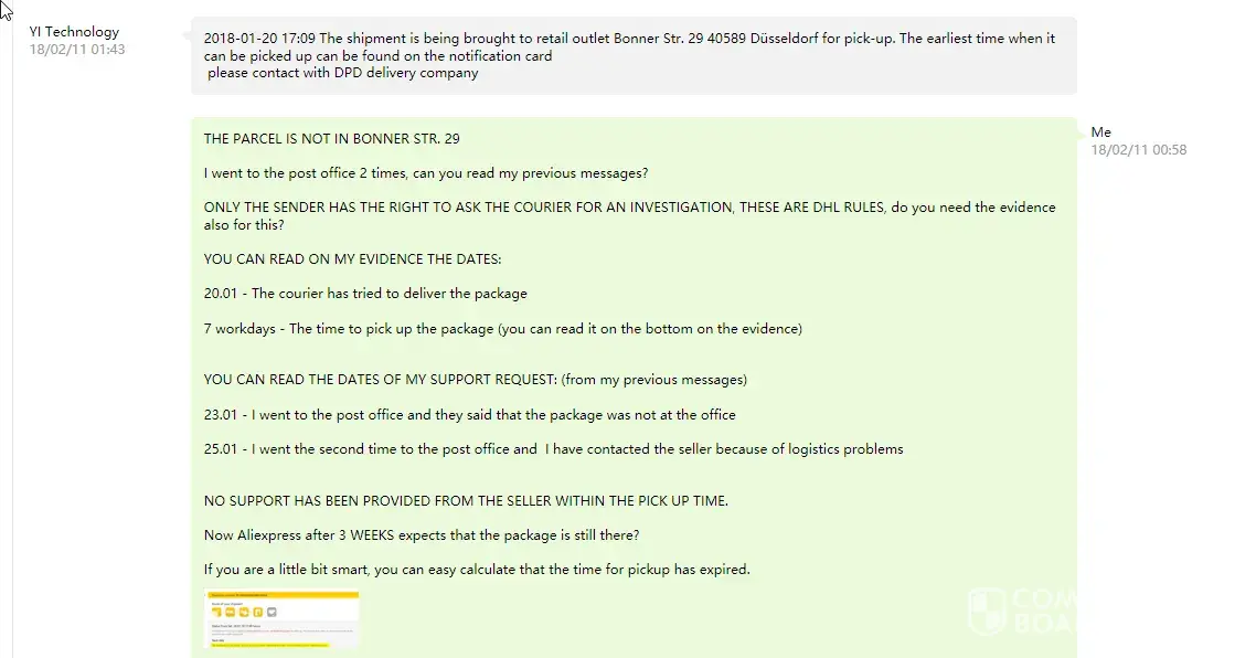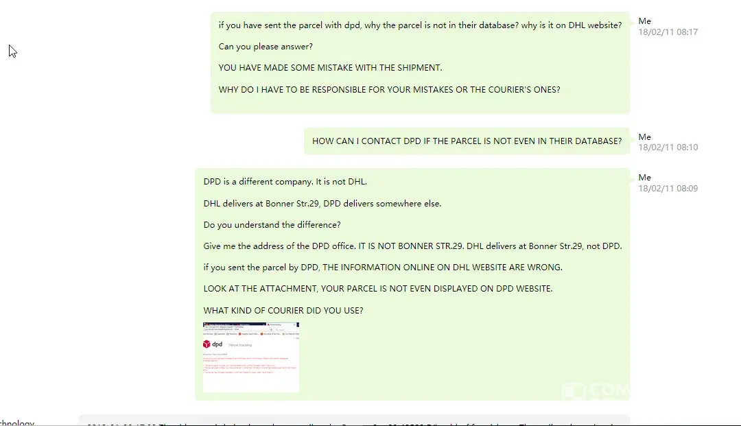 In attachment you can find a communication between the seller and me + an information in German which states that only the sender can ask for an enquiry and that most likely the courier has lost the package.