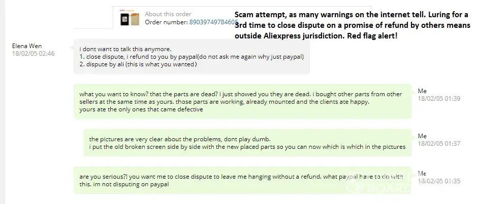 He tried to lure me into closing dispute and give money by Paypal. But has i read in the internet, that is a scam to make us close dispute and then we cant reopen it. Then you're left with no money and no protection. But Aliexpress customer service does not work, so the so called protection is a fraud.