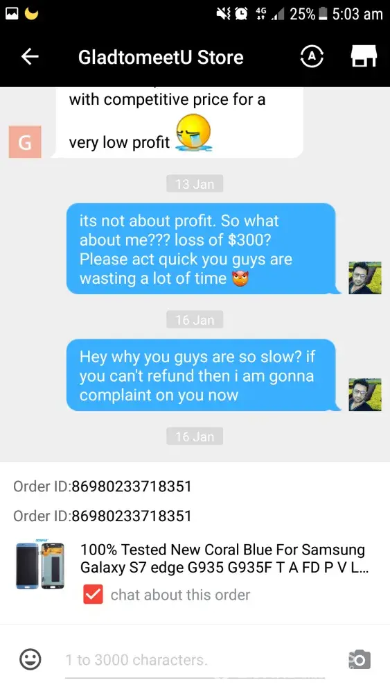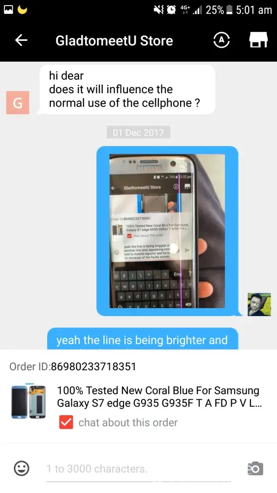 I had bought an LCD screen for samsung galaxy s7 edge order ID [protected] after using some days a pink line appeared from top to bottom of screen and eventually went on increasing and ciuldnot use it by now. When the line appeared on screen I talked to the seller about the faulty screen but they said they donot have another product to replace and as I have used the faulty LCD for sometime they will refund partially although the problem appeared within warranty period.
